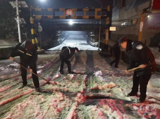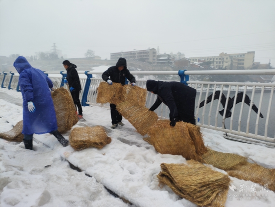 2月22日上午,在東洲橋路段掃雪現(xiàn)場,赤壁市建工集團工作人員正頂風(fēng)冒雪手持鐵鍬、雪鏟等清掃工具,鏟除橋梁上的積雪,鋪設(shè)草毯防滑。