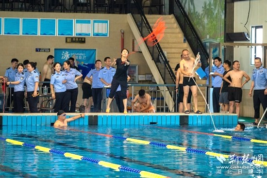 來到游泳館,市級(jí)教官、交管局車管所副所長、二級(jí)警長劉思杰現(xiàn)場培訓(xùn)救生桿、救生圈、救生繩、救生衣等救援器材規(guī)范操作,并下水操作展示涉水救援處置流程、救援器材使用等專業(yè)技能。