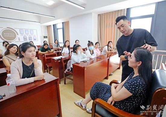 培訓(xùn)室內(nèi),30名通過(guò)人社“一湖三鏈”數(shù)據(jù)湖+就業(yè)服務(wù)站鐵腳板匹配的女性居民,正在接受來(lái)自盛美化妝美甲培訓(xùn)技能學(xué)校的就業(yè)指導(dǎo)師周艷君的精準(zhǔn)培訓(xùn)。