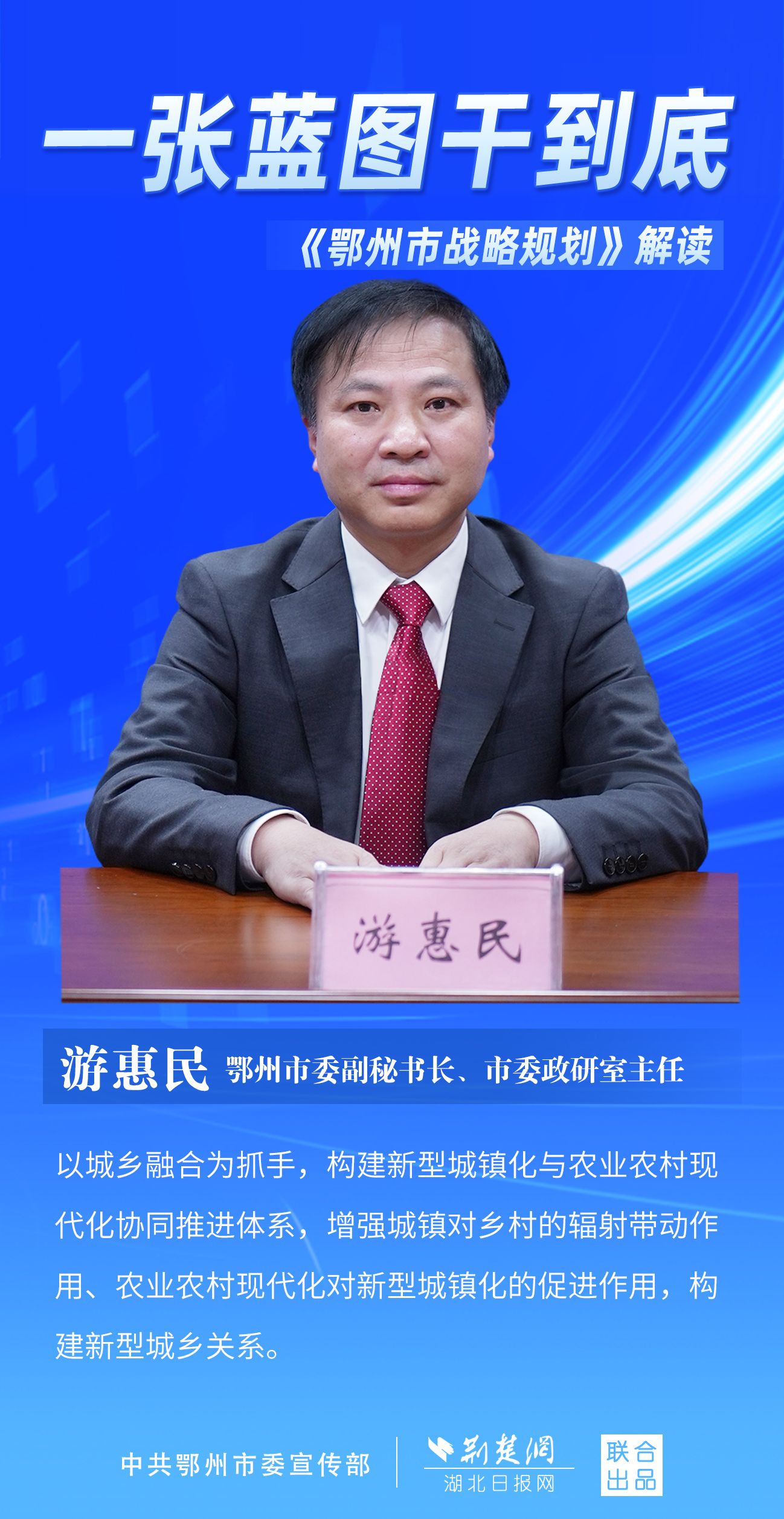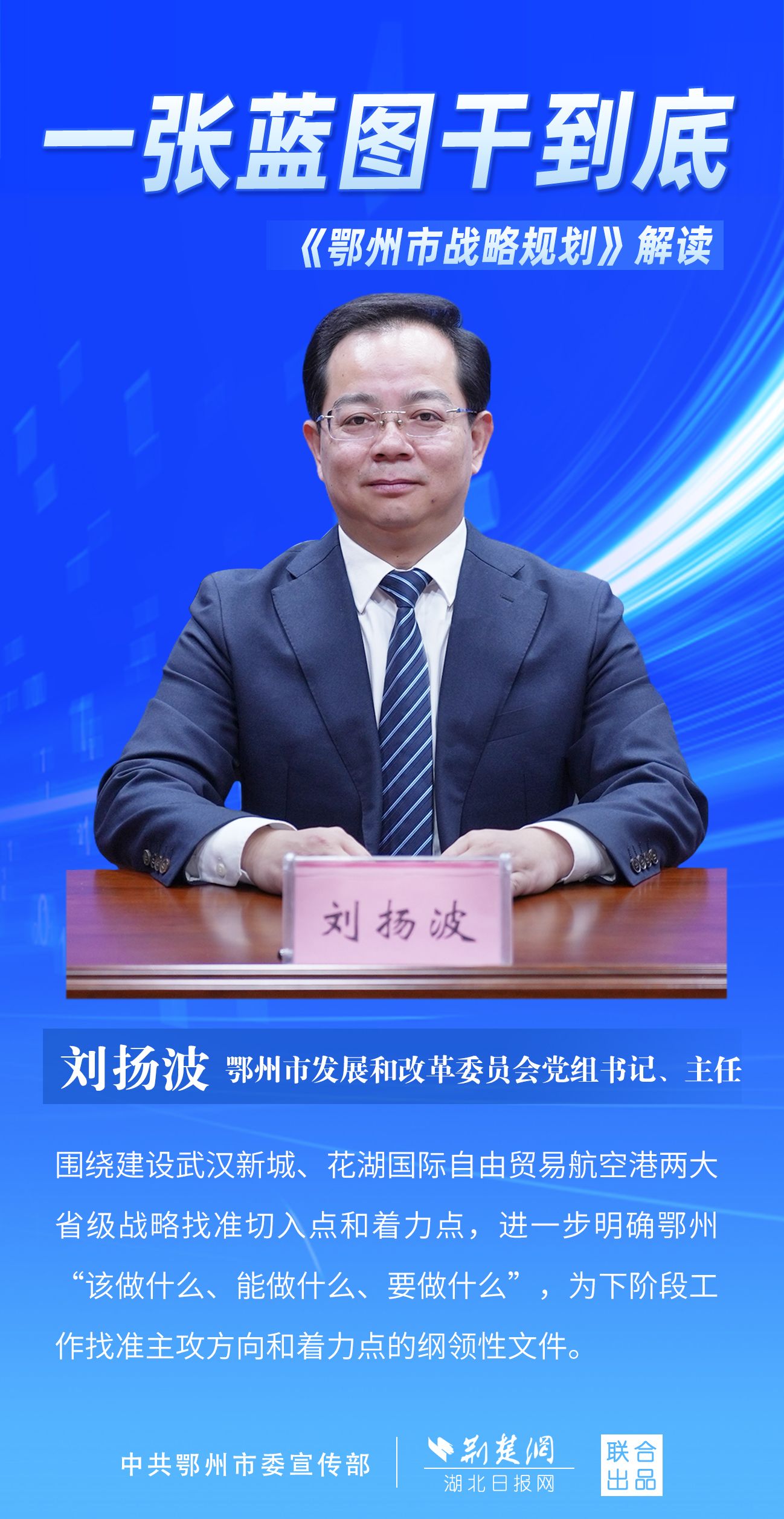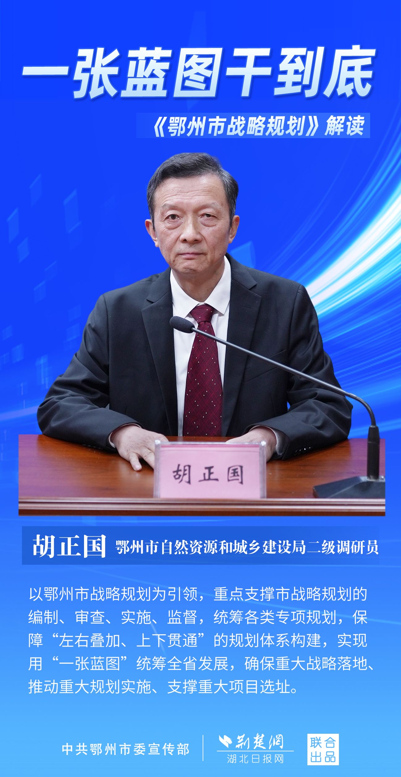荊楚網(wǎng)(湖北日報網(wǎng))訊(記者 劉璐、金康 通訊員 胡彥)11月7日上午,鄂州市召開新聞發(fā)布會,宣布《鄂州市戰(zhàn)略規(guī)劃》即將印發(fā)實施。市委副秘書長、市委政研室主任游惠民透露,從機制優(yōu)化、指標(biāo)考核、項目實施等方面確保規(guī)劃制度有依據(jù)、成效可考核、實施有抓手。具體如何落實落地?讓我們用一組海報解讀《鄂州市戰(zhàn)略規(guī)劃》。
