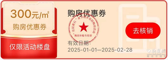 值得注意的是,此次專場活動的“購房優(yōu)惠券”僅限在參與本次專場“大優(yōu)惠”活動的房地產(chǎn)項目房源中使用,不能同時參與“一口價”優(yōu)惠活動?!百彿績?yōu)惠券”僅限在2025年1月1日至2月28日期間使用,逾期未使用則自動失效。