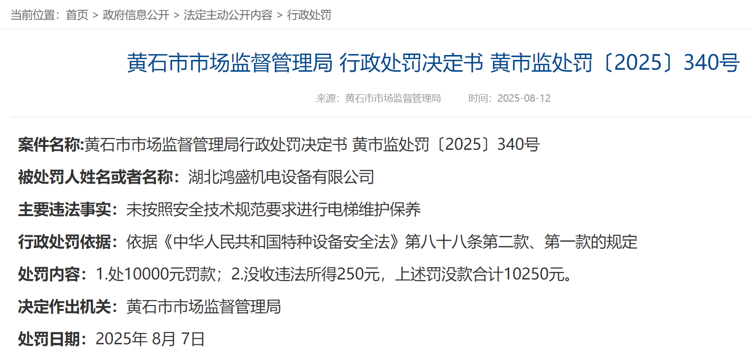 公告顯示,三家受處罰企業(yè)分別為湖北鴻盛機(jī)電設(shè)備有限公司、黃石市中信電梯工程有限公司和深圳市開元科創(chuàng)樓宇科技有限公司。主要違法事實(shí)均為“未按照安全技術(shù)規(guī)范要求進(jìn)行電梯維護(hù)保養(yǎng)”。依據(jù)《中華人民共和國特種設(shè)備安全法》第八十八條第二款、第一款的規(guī)定,黃石市市場(chǎng)監(jiān)督管理局在統(tǒng)一作出處10000元罰款的同時(shí),還分別對(duì)三家違法企業(yè)分別處以沒收違法所得250元、258.33元、282.27元。