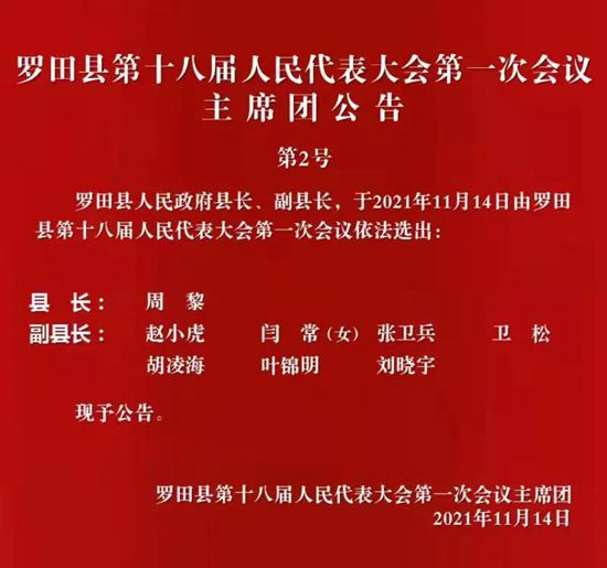 荊楚網(wǎng)(湖北日報網(wǎng))訊(通訊員顏紅勝、陳欽)羅田縣第十八屆人民代表大會第一次會議,選舉產(chǎn)生新一屆縣政府領(lǐng)導(dǎo)班子,周黎當(dāng)選羅田縣人民政府縣長,趙小虎、閆常、張衛(wèi)兵、衛(wèi)松、胡凌海、葉錦明、劉曉宇當(dāng)選為羅田縣人民政府副縣長。
