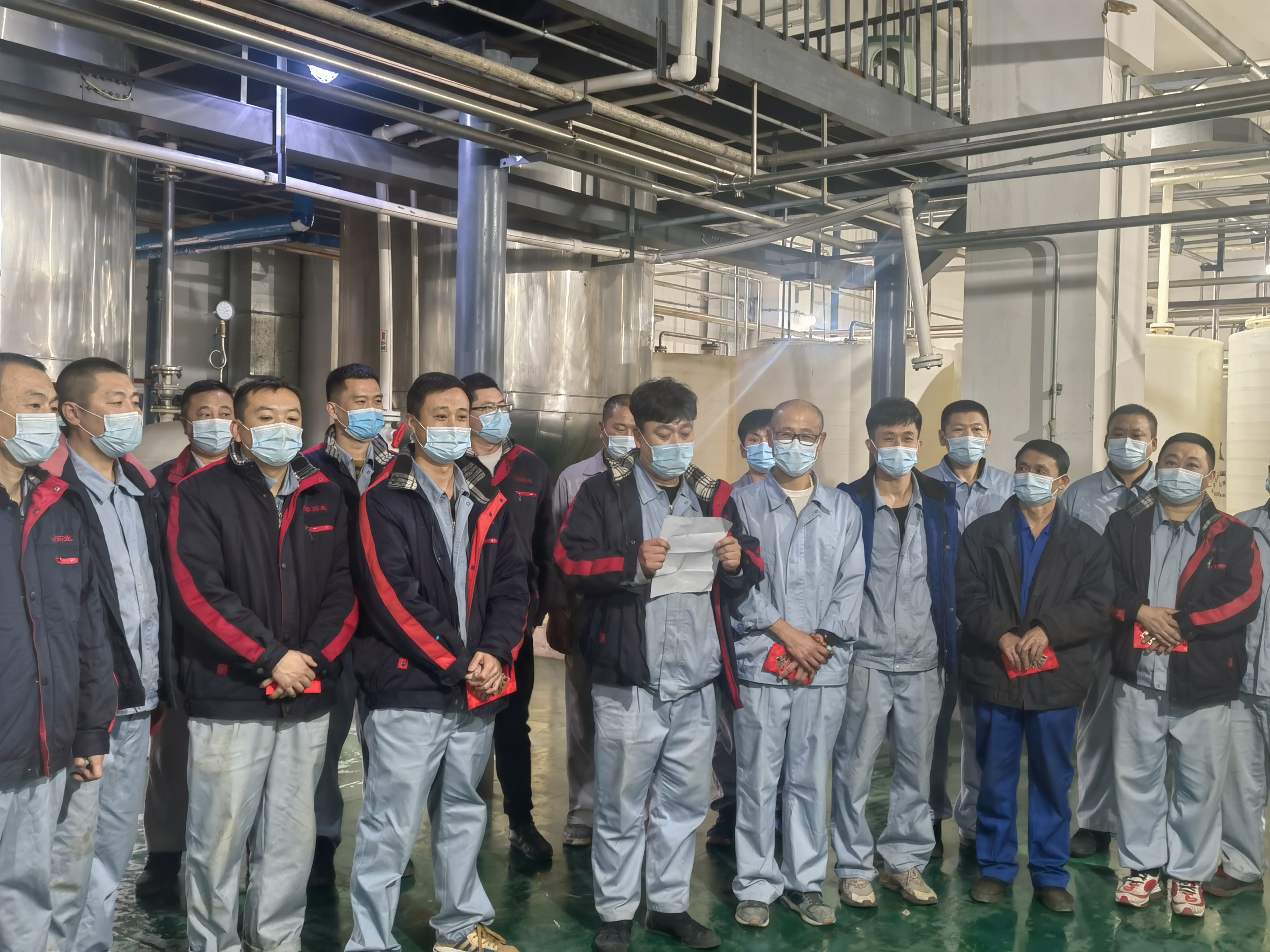 作為保供企業(yè),為了滿足市場藥品需要,公司重點供應(yīng)藥品的生產(chǎn)不能停。經(jīng)過向上級疫情防控指揮中心申請獲批準后,公司研究決定,在原料生產(chǎn)總監(jiān)劉剛組織下,在鑫泰基副總經(jīng)理劉新華、原料車間副主任馬尚、于洋帶領(lǐng)下,原料車間的32名一線員工他們甚至都沒有時間來得及安頓好家人,毫不猶豫的從29日起,就開始日夜堅守在了工作崗位上。由于人員有限,生產(chǎn)任務(wù)艱巨,他們每個人的工作量都要超出平常工作強度,有些員工常常深夜還忙碌在生產(chǎn)崗位上,有時天還沒亮,就又開始了新一天的工作。白天他們加緊生產(chǎn),晚上就睡在潔凈區(qū)、操作間、休息室、辦公室臨時準備的鋪蓋上,窄小的折疊床上。由于緊張的工作頻率,又不能夠很好的休息,很多員工感冒了,但他們沒有一個人退縮,沒有一句怨言,吃著感冒藥、消炎藥在崗位上堅守了十余天,保質(zhì)保量完成了生產(chǎn)任務(wù)。