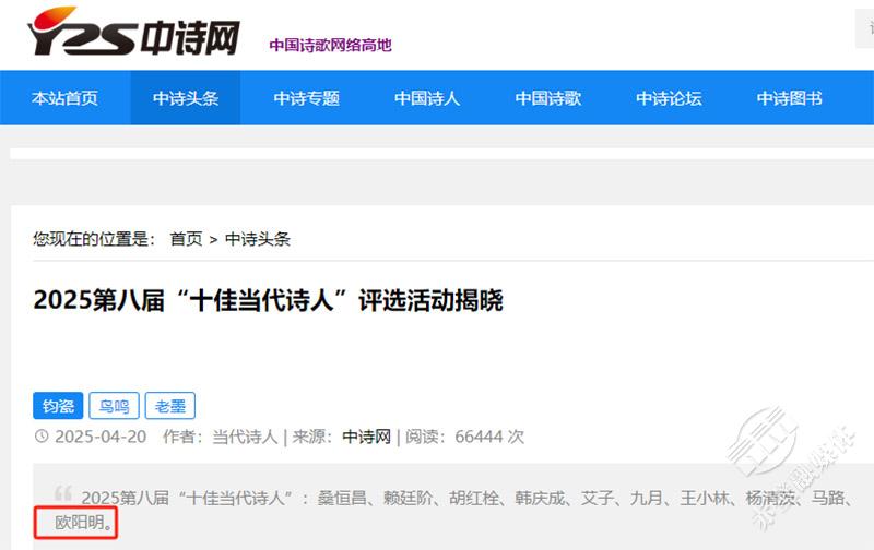 4月20日,2025第八屆“十佳當(dāng)代詩(shī)人”評(píng)選活動(dòng)揭曉評(píng)選結(jié)果塵埃落定,赤壁詩(shī)人歐陽(yáng)明光榮上榜,這是赤壁詩(shī)人首次在該榜亮相。