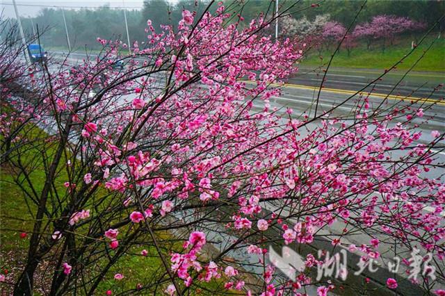 2月13日,咸寧市咸安區(qū)桂鄉(xiāng)大道兩旁的紅梅花在風(fēng)雨中含笑迎賓。眼下,隆冬尚未消退,風(fēng)雨交夾,寒氣逼人。位于湖北省南部的咸寧市,紅梅花在枝頭綻放,預(yù)示著春天的腳步越來越近了。(湖北日?qǐng)?bào)全媒記者 陳勇 攝)