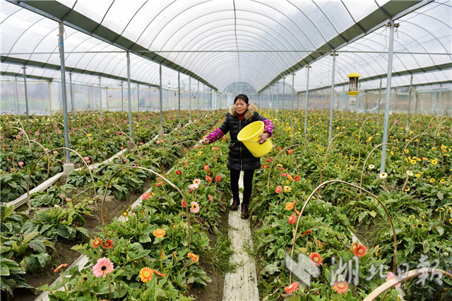 2月20日,湖北省通城縣石南鎮(zhèn)賽公村非洲菊種植專業(yè)合作社社員在管護(hù)非洲菊。