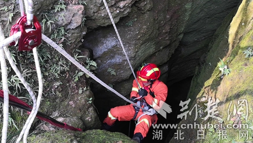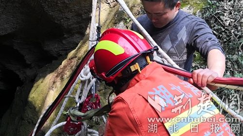 因消防車(chē)無(wú)法抵達(dá),消防員帶上救援工具,徒步半個(gè)多小時(shí)迅速趕赴事發(fā)現(xiàn)場(chǎng)開(kāi)展救援。到達(dá)現(xiàn)場(chǎng)后,發(fā)現(xiàn)一名三十多歲男性在一個(gè)10多米的深洞內(nèi)呼救。經(jīng)與被困者和現(xiàn)場(chǎng)群眾溝通了解,此洞名為藏龍洞,是一個(gè)未經(jīng)商業(yè)開(kāi)發(fā)的深洞,有著悠久的歷史傳說(shuō),引來(lái)無(wú)數(shù)探險(xiǎn)者,這名男子也是因?yàn)楹闷?,下洞后體力不支無(wú)法再攀爬出洞被困洞底。中隊(duì)指揮員根據(jù)現(xiàn)場(chǎng)情況,立即利用救援繩索做好安全支點(diǎn),消防員何聰點(diǎn)降至洞底查看被困者情況,所幸洞內(nèi)空氣流暢,被困者無(wú)二次受傷的危險(xiǎn),消防員利用隨身攜帶的全身吊帶將被困者固定好后,經(jīng)洞外消防員齊力,最終經(jīng)過(guò)20多分鐘的救援,被困人員被成功營(yíng)救出山洞。