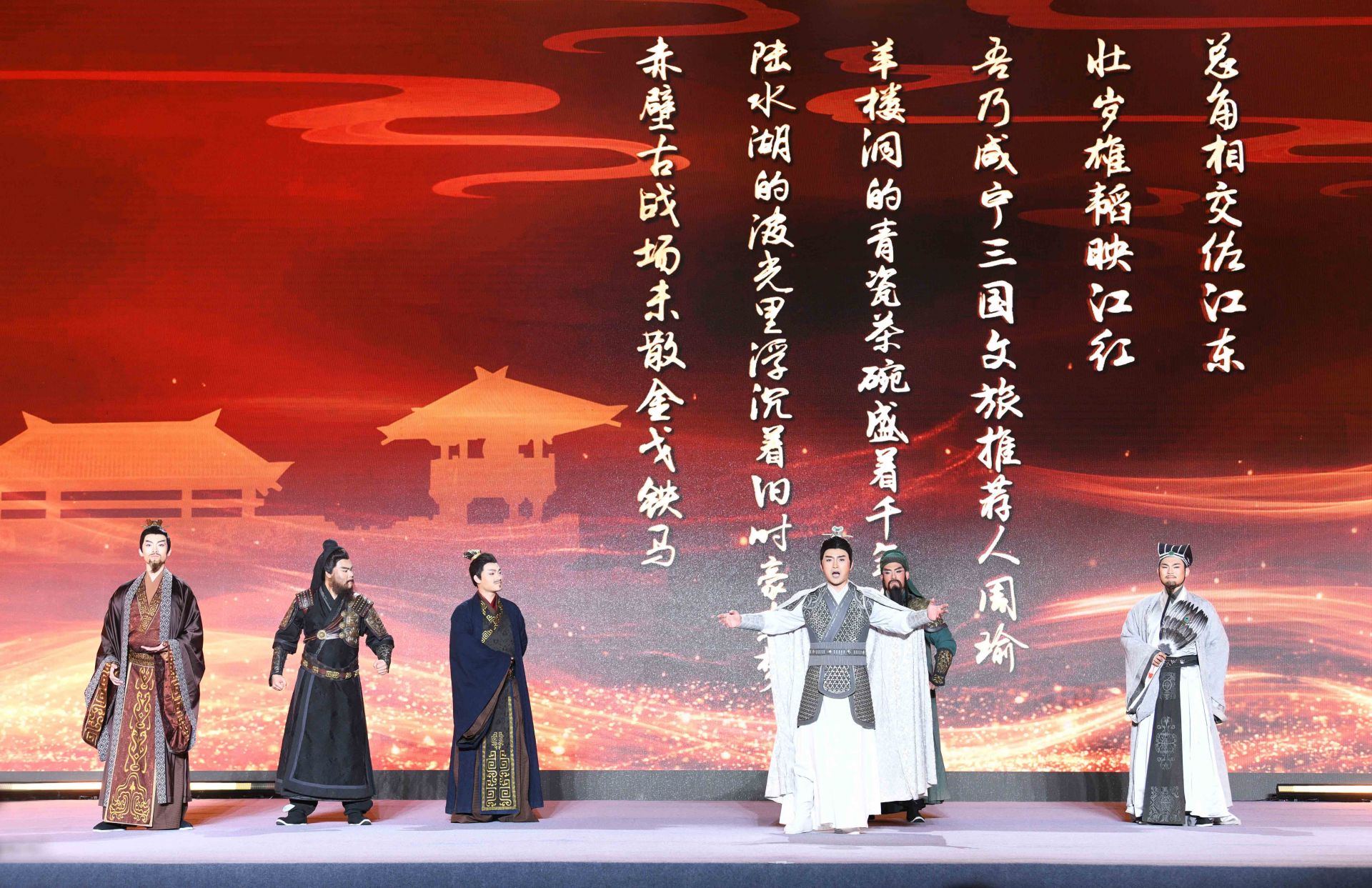 “三國六城,今日結(jié)盟!與君共同開啟,荊楚三國文化之旅?!眴邮缴希碇叛b的文旅推薦官,化身三國英雄劉備、關(guān)羽、張飛、諸葛亮、孫權(quán)、周瑜等,穿越歷史時空,分別代表武漢、荊州、宜昌、襄陽、鄂州、咸寧對外推介各地三國旅游景點和線路。