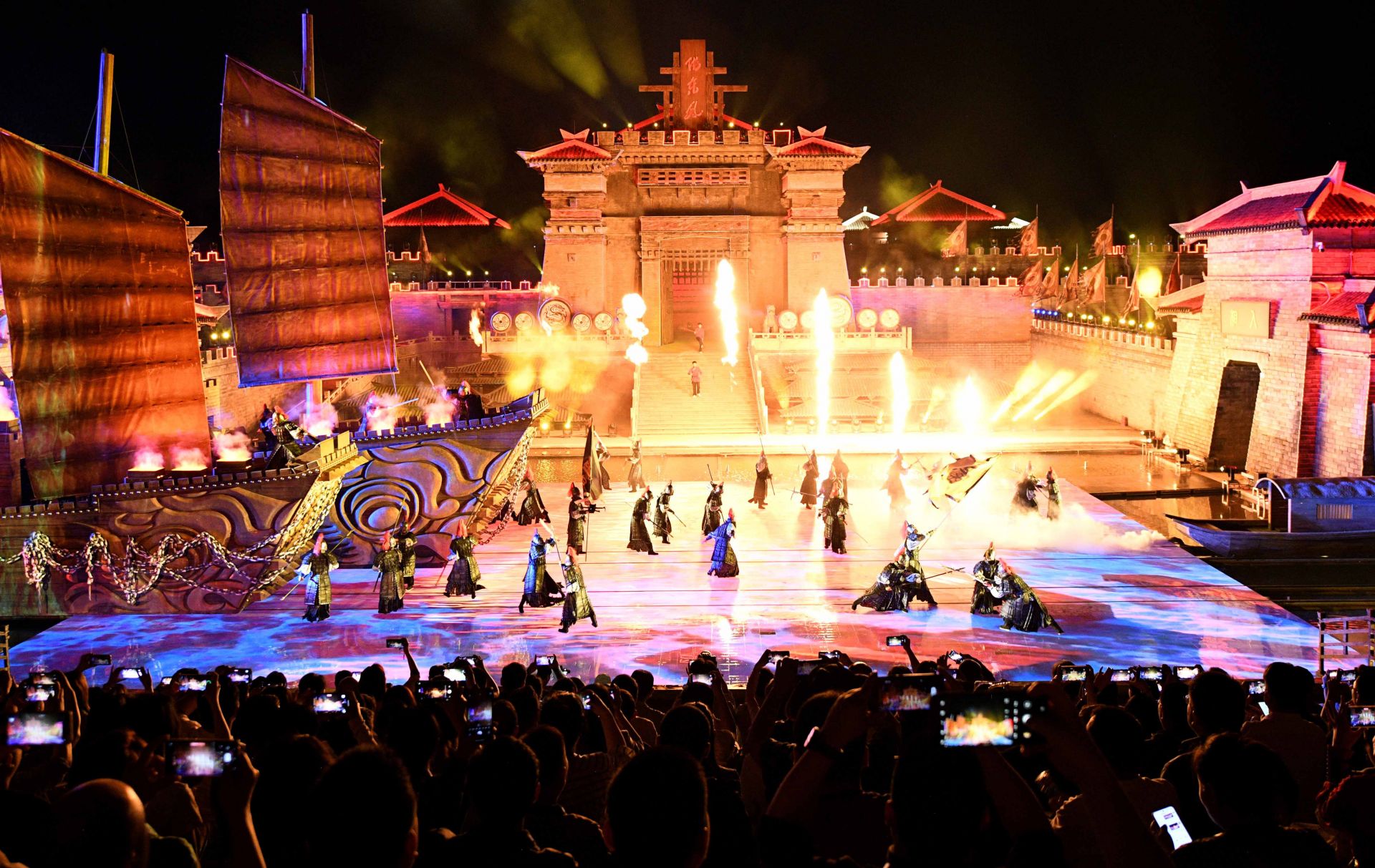 熊熊燃燒的烈火,箭矢破空的銳響,戰(zhàn)鼓擂動的轟鳴,配上光影、水霧等特效,讓人仿佛置身金戈鐵馬、智謀激蕩的三國古戰(zhàn)場,親歷那場“以少勝多”的赤壁之戰(zhàn)。