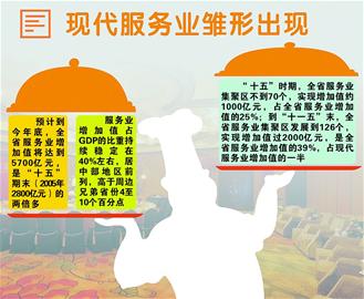 五年來,全省不斷改造提升傳統(tǒng)服務業(yè),大力發(fā)展需求潛力大的現(xiàn)代服務業(yè),鞏固提高商貿(mào)等支柱服務業(yè)的整體規(guī)模和水平,實現(xiàn)了多個新興行業(yè)和關(guān)鍵領(lǐng)域的重點突破,基本形成了二、三產(chǎn)業(yè)共同拉動經(jīng)濟又好又快增長的格局。省發(fā)改委表示,下一個5年,我省將力爭形成物流、旅游、金融、文化、信息、中介6個增加值或收入過千億元的現(xiàn)代服務業(yè)產(chǎn)業(yè),力爭服務業(yè)增加值實現(xiàn)過萬億元的突破,占全省GDP比重達到43%。